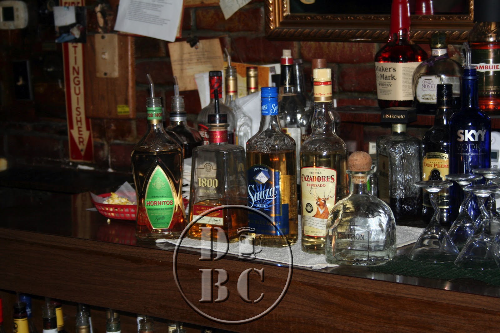 The Bar: Seating for about 20 around the U-shaped bar and some additional tables along the wall. Decor around the bar consists of old Christmas lights and stained glass.